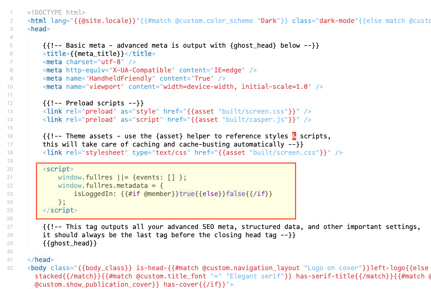 {{ghost_head}}snippet within the<head>section of thedefault.hbsfile. - Add the following code snippet right above the